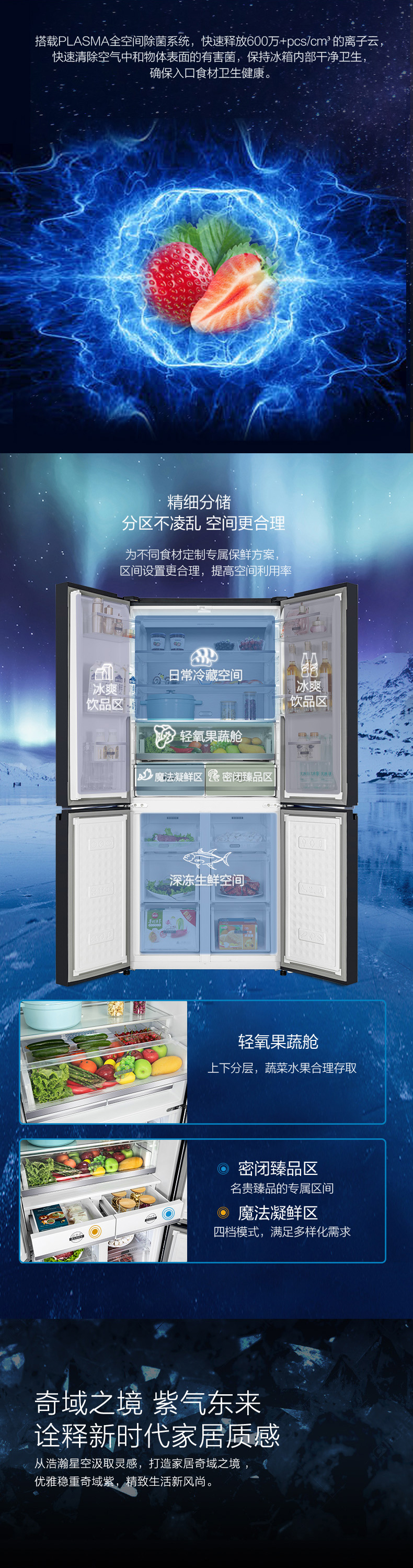 針對每種食材進行精細化分區,定制專屬保鮮艙,涵蓋肉類保鮮、果蔬保鮮、母乳儲存、干貨儲存以及除菌凈味五個維度,確保每一件食材的新鮮儲存